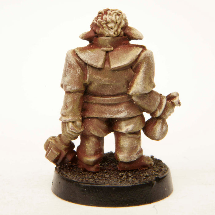 This 25mm tall male Half-Orc Boy has a great amount of detail for dungeon-crawling, RPGs and table top war games. Miniature could be used as a Young Boy, Civilian, Thief, Bully, Child, Young Warrior . This Half-Orc Boy is equipped with small mace, coin purse, bare foot, and collared jacket . 25mm diameter slotted round plastic base included. Figure is made of 100% lead free pewter.