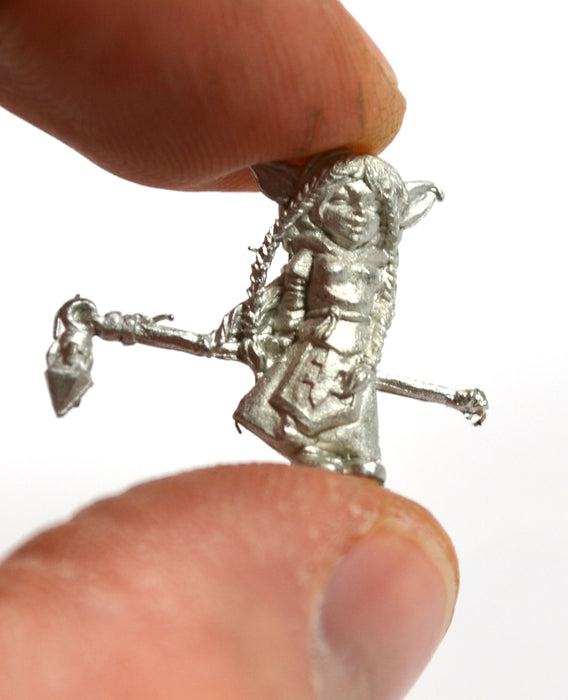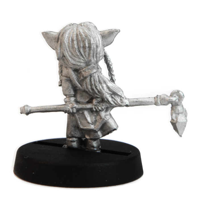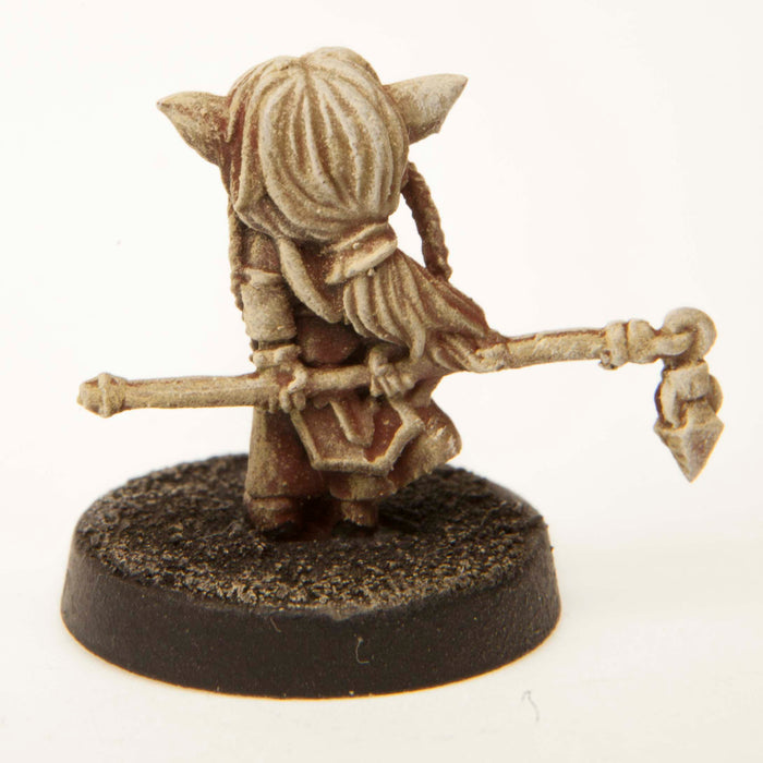 This 19 mm tall Gnome Female Cleric has a great amount of detail for dungeon-crawling, RPGs and table top war games. Miniature could be used as a Wizard, Mage, Priest, Druid, Warlock, Caster or Healer. This gnome is equipped with a long staff, Elf Ears, Clerical Robes, and Braided Hair. 19mm diameter slotted round plastic base included. Figure is made of 100% lead free pewter. Miniatures come unassembled and unpainted, some filing may be needed to clean up excess flashing, or sprue. The pictures of the painted miniatures are for inspiration and are only examples, these ship unpainted. Base tab on the miniature may be smaller than the slot in the provided base, some filing may be required.