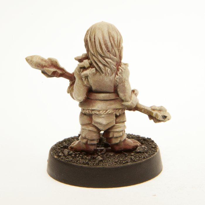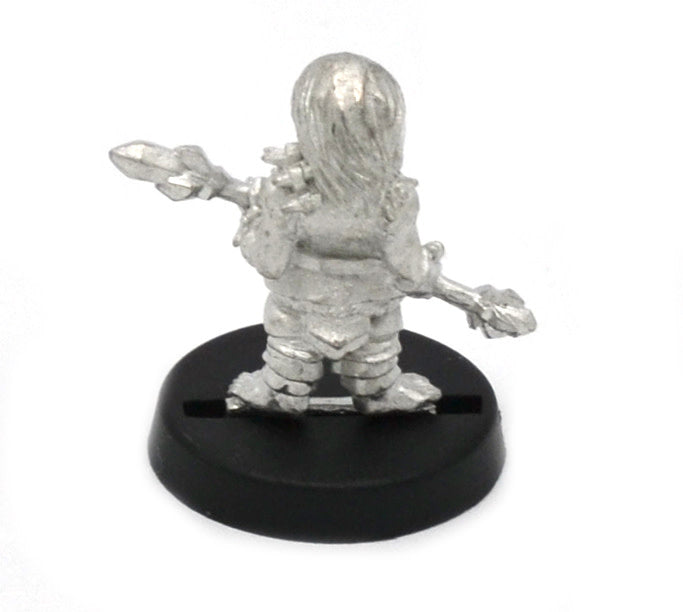 This 21mm tall male Halfling Psion has a great amount of detail for dungeon-crawling, RPGs and table top war games. Miniature could be used as a Wizard, Mage, Sorcerer, Druid, Barbarian, Warlock, Arcanist. This Halfling Psion is equipped with a staff with gems on each end, hide armor, and a bad 80's hair. 20mm diameter slotted round plastic base included. Figure is made of 100% lead free pewter.