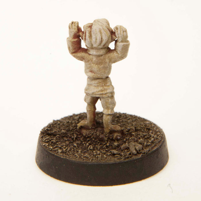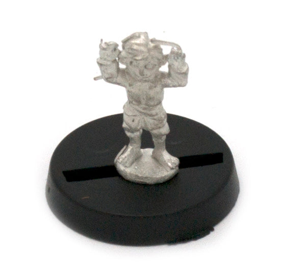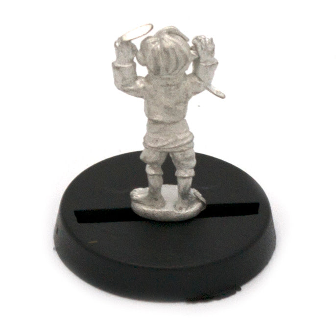 This 16mm tall male Elf Baby has a great amount of detail for dungeon-crawling, RPGs and table top war games. Miniature could be used as a Child, Kid, Runt, Your hero as a child, Some creepy ghost child. This Elf Baby is equipped with sturdy clothes and his arms raised . 20mm diameter slotted round plastic base included. Figure is made of 100% lead free pewter.