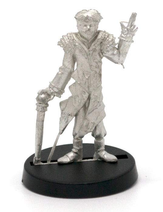 This 31mm tall male Elf Illusionist has a great amount of detail for dungeon-crawling, RPGs and table top war games. Miniature could be used as a Illusionist, Wizard, Warlock, Mystic, Cleric, Wiseman, Civilian . This Elf Illusionist is equipped with cane, majestic coat, and a goatee. 25mm diameter slotted round plastic base included. Figure is made of 100% lead free pewter.