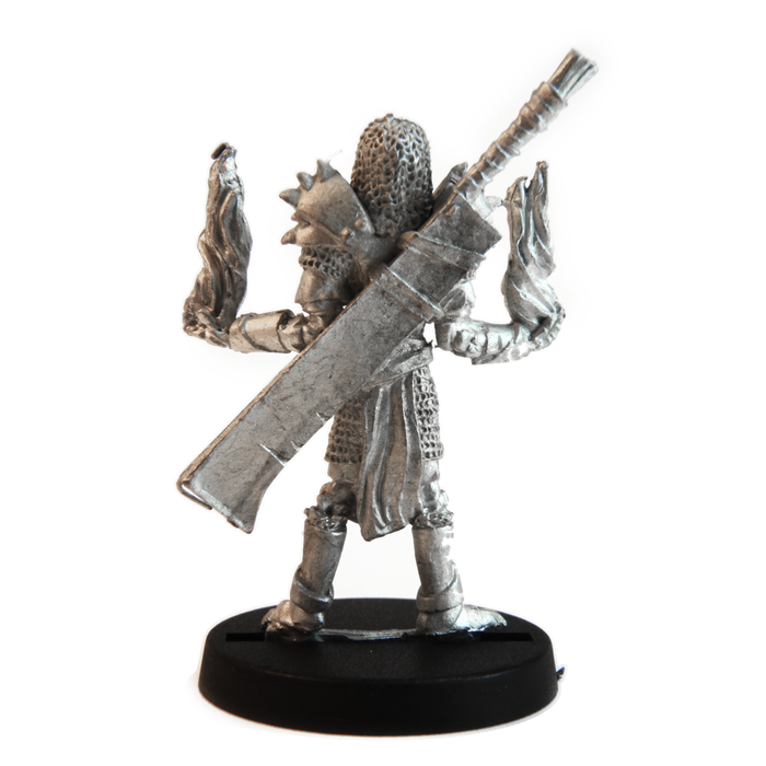 This 39mm tall male Elf Undead Mage has a great amount of detail for dungeon-crawling, RPGs and table top war games. Miniature could be used as a Undead Mage, Wizard, Sorceress, Mystic, Element Master, Skeleton. This Elf Undead Mage is equipped with extra long clever, spike shoulder caulders, open hands with smoldering flames, and Full body protective chain mail under robes. 25mm diameter slotted round plastic base included. Figure is made of 100% lead free pewter.