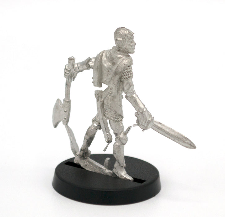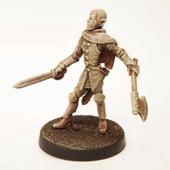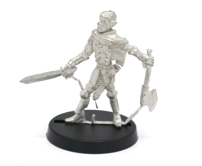 • Miniature could be used as a General, Fighter, Warrior, Swashbuckler, Paladin. This Elf Weapons Master is equipped with an axe, sword, chain mail and light armor.