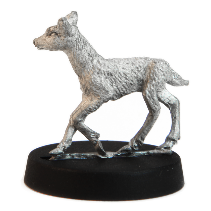 This 16mm tall Fawn has a great amount of detail for dungeon-crawling, RPGs and table top war games. Miniature could be used as a Pet, Deer, Familiar, Spirit Animal. This Fawn is equipped with a body full of fur. 20mm diameter slotted round plastic base included. Figure is made of 100% lead free pewter.