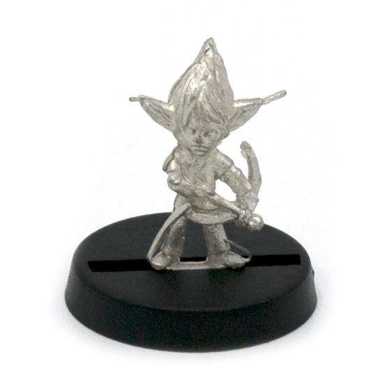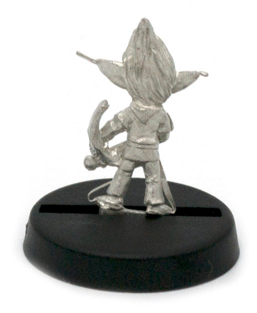 This 19mm tall male Gnome Boy has a great amount of detail for dungeon-crawling, RPGs and table top war games. Miniature could be used as a Gnome child, Civilian, towns folk, assistant. This Gnome Boy is equipped with a bow with one arrow. 20mm diameter slotted round plastic base included. Figure is made of 100% lead free pewter.