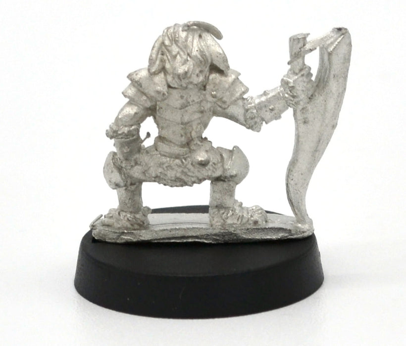 This 17mm tall male Gremlin Raider has a great amount of detail for dungeon-crawling, RPGs and table top war games. Miniature could be used as a Raider, Goblin, War chief, Warrior, Fighter. This Gremlin Raider is equipped with a large bladed axe, and heavy armor. 20mm diameter slotted round plastic base included. Figure is made of 100% lead free pewter.