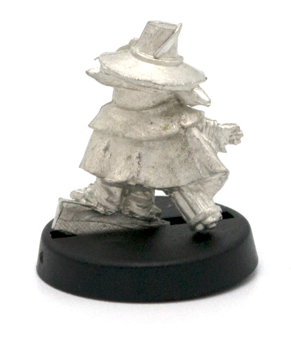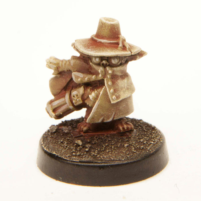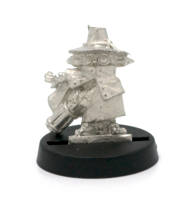 • Miniature could be used as a Goblin, Steampunk, Artificer, Pistoleer, Gunslinger. This Gremlin Stranger is equipped with turret pistol, duster, hat, and goggles.