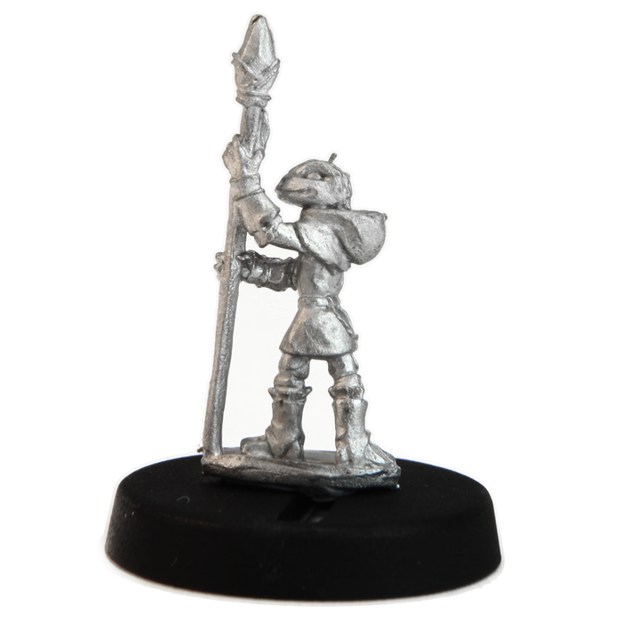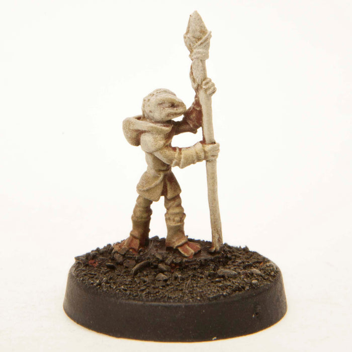 This 22mm tall male Grippli Spearman has a great amount of detail for dungeon-crawling, RPGs and table top war games. Miniature could be used as a Warrior, Fighter, Pikeman, Spearman, Mage, Shaman, Wizard. This Grippli Spearman is equipped with a long spear, hoodie, and leather boots. 20mm diameter slotted round plastic base included. Figure is made of 100% lead free pewter.
