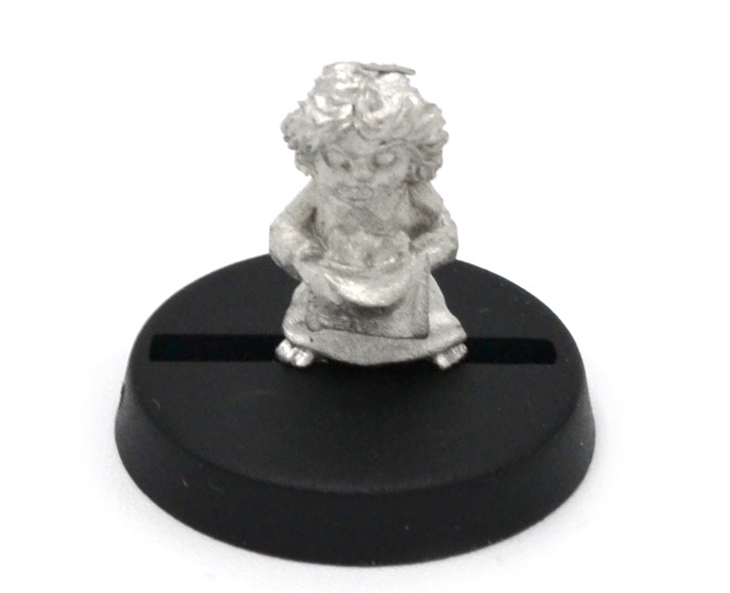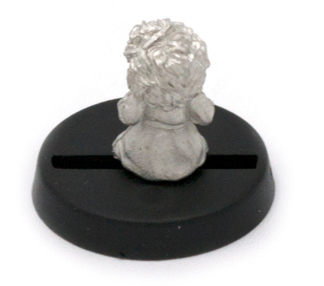 This 12mm tall female Halfling Girl has a great amount of detail for dungeon-crawling, RPGs and table top war games. Miniature could be used as a Child, Kid, Princess. This Halfling Girl is equipped with a satchel of goodies, and a dress . 20mm diameter slotted round plastic base included. Figure is made of 100% lead free pewter.