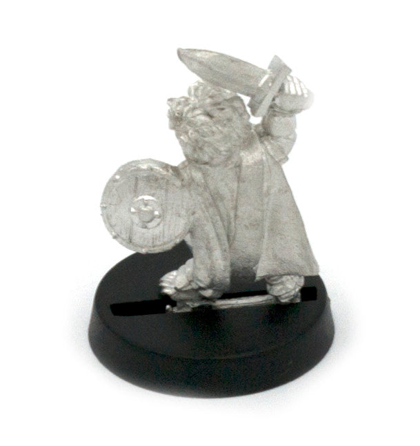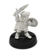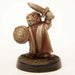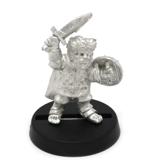 This 28mm tall male Halfling Soldier Cheering has a great amount of detail for dungeon-crawling, RPGs and table top war games. Miniature could be used as a Warrior, Guard, Infantry, Rogue, Thief, Fighter. This Halfling Soldier Cheering is equipped with a sword, shield, cloak, padded armor and his arm raised shouting to charge or for victory! . 20mm diameter slotted round plastic base included. Figure is made of 100% lead free pewter.