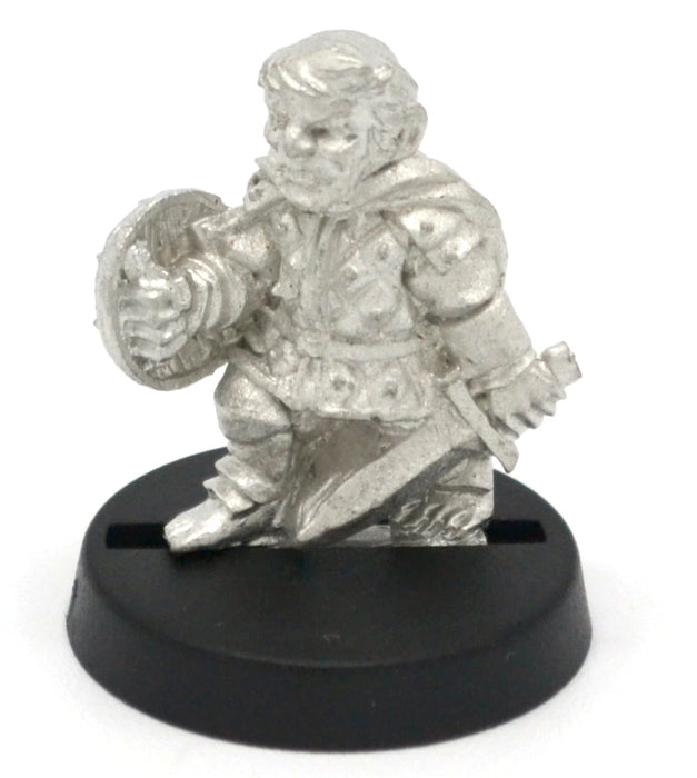 This 20mm tall male Halfling Soldier Male has a great amount of detail for dungeon-crawling, RPGs and table top war games. Miniature could be used as a Warrior, Guard, infantry, rogue, thief, fighter. This Halfling Soldier Male is equipped with a sword, shield, cloak, padded armor and hat . 20mm diameter slotted round plastic base included. Figure is made of 100% lead free pewter.