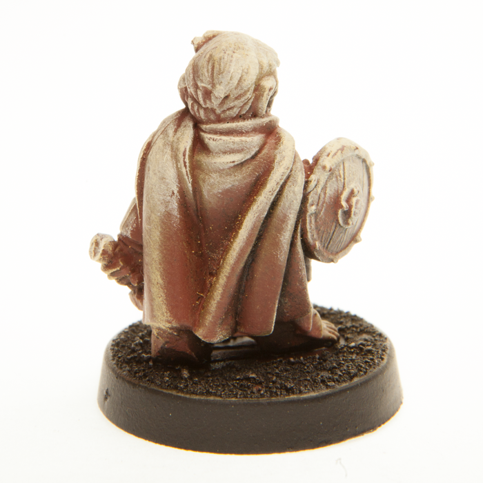 - Miniature could be used as a Warrior, Guard, infantry, rogue, thief, fighter. This Halfling Soldier Male is equipped with a sword, shield, cloak, padded armor and hat .