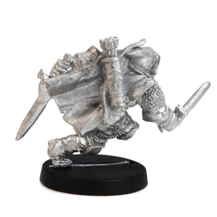 • Miniature could be used as a Ranger, Hunter, Slayer, Avenger, Beast master, rouge, Swashbuckler. This Half - Orc is equipped with a Scale mail armor, Dual wielding swords, Bow, Quiver full of arrows, hooded cloak.