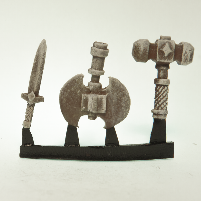 • This Weapons collection includes a 19mm sword, an 18mm axe, and a 17mm Hammer and will add a bit of detail to dungeon crafting, dungeon-crawling, RPGs and table top war games.