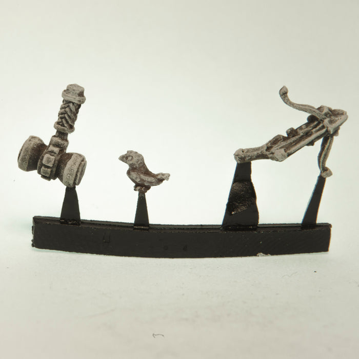 These Weapons (10mm tall), and the canary (4mm tall) will add a bit of detail to dungeon crafting, dungeon-crawling, RPGs and table top war games. Miniature parts could be used in dungeon crafting, to represent rewards to players of tabletop RPGs, or to modify miniatures to add additional weapons/gear. No base included. Parts are made of 100% lead free pewter. The pictures of the painted miniatures are for inspiration and are only examples. Miniatures come unassembled and unpainted, some filing may be needed to clean up excess flashing, or sprue.