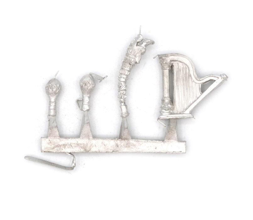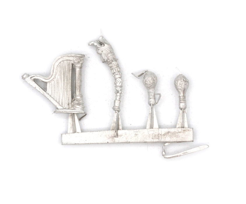 • Includes 3 small pewter musical Instruments attached to a tab. Designed to enhance your tabletop role-playing and battle games. Includes a harp (14mm tall) a Dwarven Battle Horn (18mm long), and 2 Maracas (8mm tall).