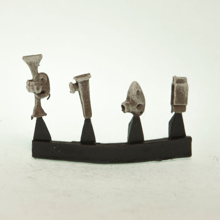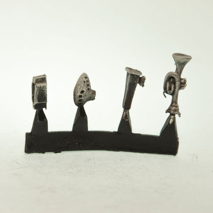 • Includes 4 small pewter musical Instruments attached to a tab. Designed to enhance your tabletop role-playing and battle games. Includes a trumpet (8mm long) a Kazoo (6mm long), an Ocarina (5mm long), and a harmonica (5mm long).