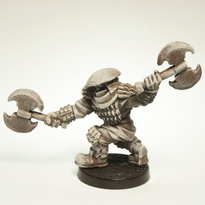 - Miniature could be used as a berserker, fighter, or warrior. This Half-Orc is equipped with scale-mail armor, twin axes, and a magical scroll.