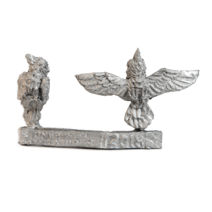 These 12mm tall (20mm wingspan for the crow that is flying) Miniature Crows have a great amount of detail for Dungeon-crawling, RPGs and table top war games. Miniatures could be used as familiars, pets, crows, sparrows, starlings, jays...pretty much any kind of medium/small bird that doesn't have a large crest or some other super-distinguishing feature. There are two of them included. One perched, the other with wings spread. No base or mount included. Made of 100% lead free pewter. The pictures of the painted miniatures are for inspiration and are only examples. Miniatures come unassembled and unpainted, some filing may be needed to clean up excess flashing, or sprue.