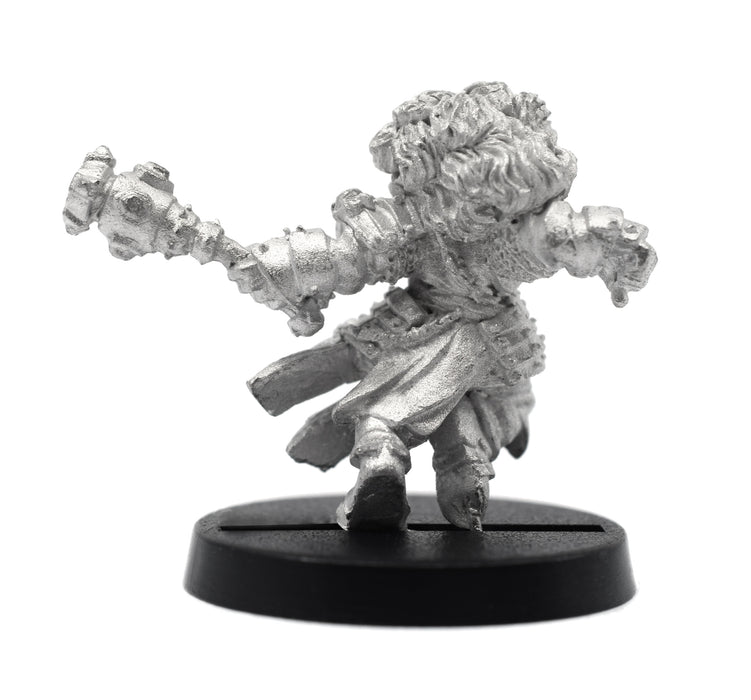 This 25mm tall (21mm from the feet to the eyes) Female Dwarven Cleric has a great amount of detail for Dungeon-crawling, RPGs and table top war games. Miniature could be used as a fighter, ranger, druid, cleric, paladin, warrior. This dwarf comes equipped with a Mace, Leather armor, and various trinkets, relequaries, and holy symbols. 25mm diameter slotted round plastic base included. Made of 100% lead free pewter. The pictures of the painted miniatures are for inspiration and are only examples. Miniatures come unassembled and unpainted, some filing may be needed to clean up excess flashing, or sprue.