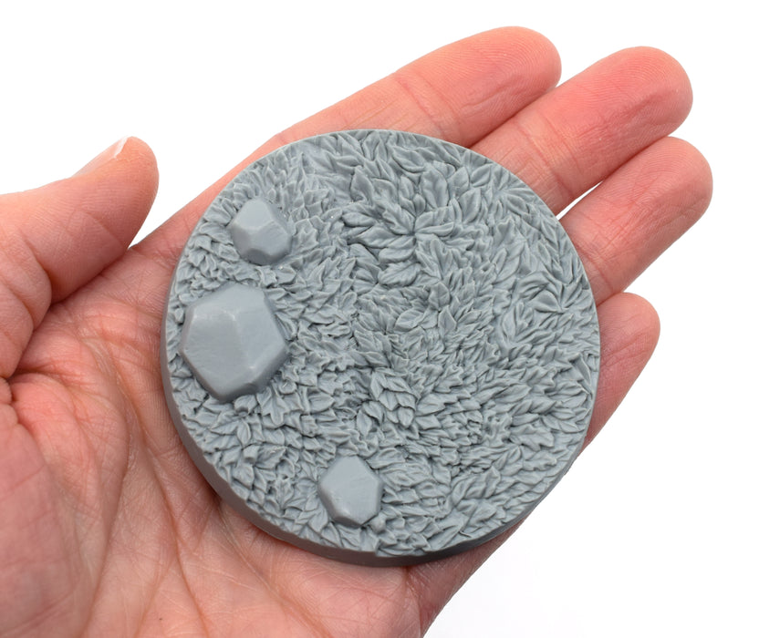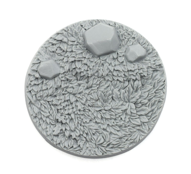Bring your Dungeon-crawling, RPGs and table top war game elements to life with a miniature base featuring realistic details and lifelike textures. The 65mm (2.5") size base is perfect for larger miniature and giants (sold separately). This base features an unpainted surface texture of leaves, with three large rocks. Ready to be painted and customized for your indoor or outdoor game scenes. Each base design was hand carved by Stonehaven creator Mike Evans, and then cast in 100% urethane resin.