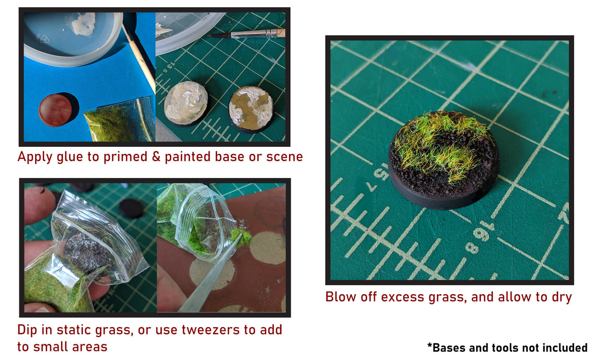 To apply the grass to your miniature base, simply paint a 1/1 mixture of water and white glue (not included) on the areas which you would like to add your grass to. Dip your base directly into your static grass, or use tweezers (not included) to place the grass in desired areas. Gently blow on base to remove excess and to give the grass a natural, more aligned appearance. Allow to dry before use.