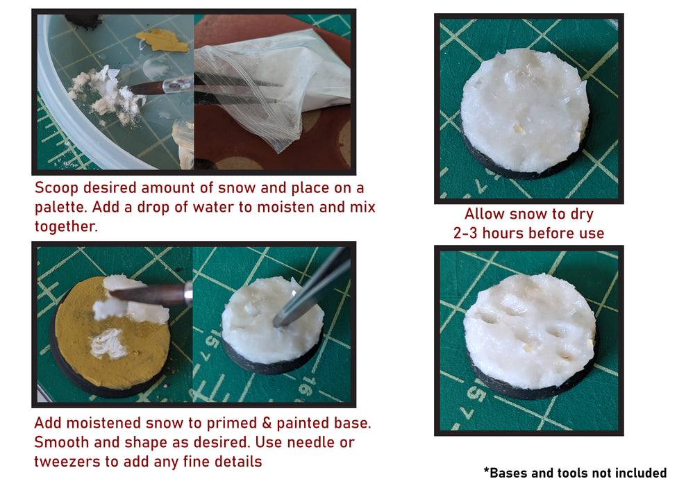 ARTIFICAL SNOW FLOCK :::To apply this snow flock to your miniature base, scoop your desired amount of snow on to a palette and add a drop of water to moisten it. Scoop the moistened snow on to your miniature base (or scene). Using a paintbrush (not included) smooth and shape your snow as desired. A few basic tools, such as tweezers, a needle, or a dotting tool (not included) can be used to add footprints or other finishing details to your snowy terrain. Requires 2-3 hours dry time.