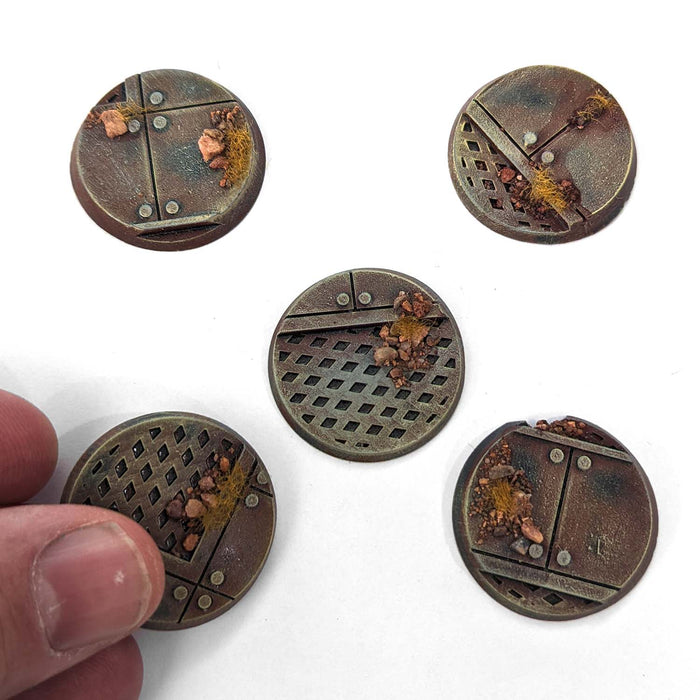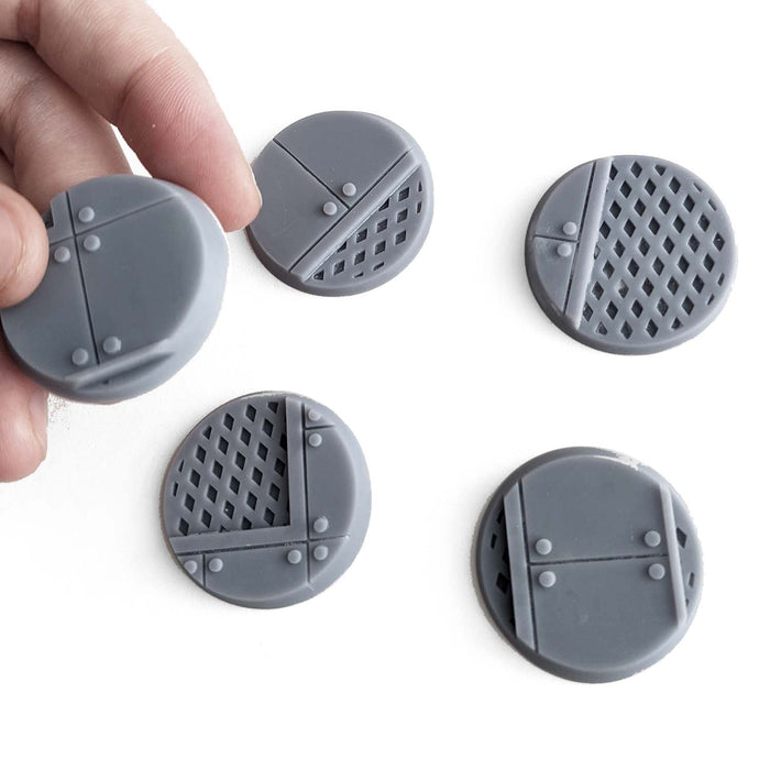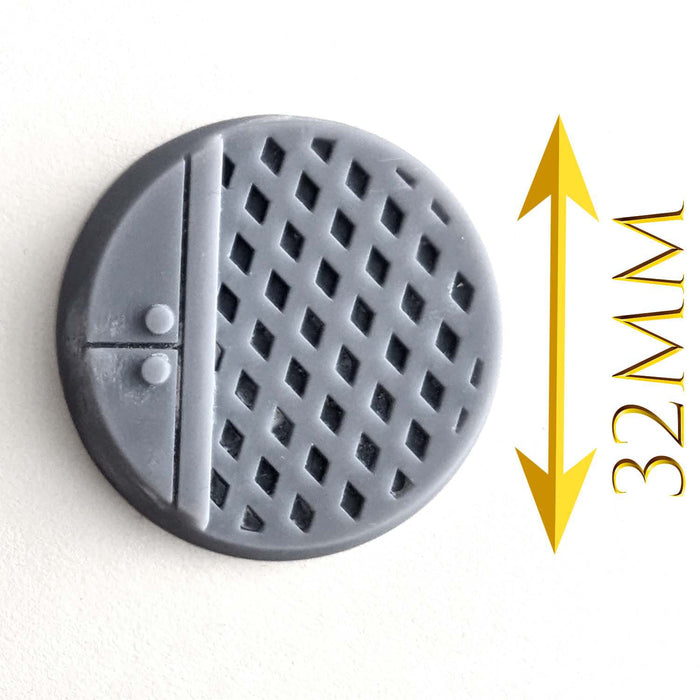 - SCENIC BASE || Various industrial walkway textures, synthetic durable material, designed for 28mm Scale Tabletop War Game Miniatures (Painted Example Photo for reference only, actual bases are grey. Due to resin manufacturing process, actual shape of base may vary slightly from those shown.)