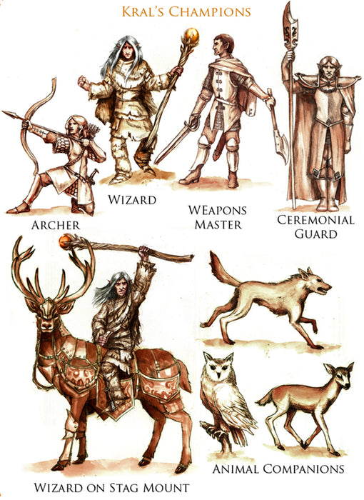 - Kral's Champions includes 8 Miniatures to lead in any fantasy army. Each miniature features a great amount of detail for Dungeon-crawling, RPGs and table top war games